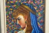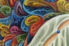 Фон картины — калейдоскоп ярких цветов и узоров, которые, кажется, отражают внутренний мир модели. Этот фон, выполненный в технике, напоминающей мозаику или витраж, создаёт ощущение движения, живости и непредсказуемости. Цвета и узоры, переплетаясь между собой, словно рассказывают какую-то историю или содержат скрытый смысл.