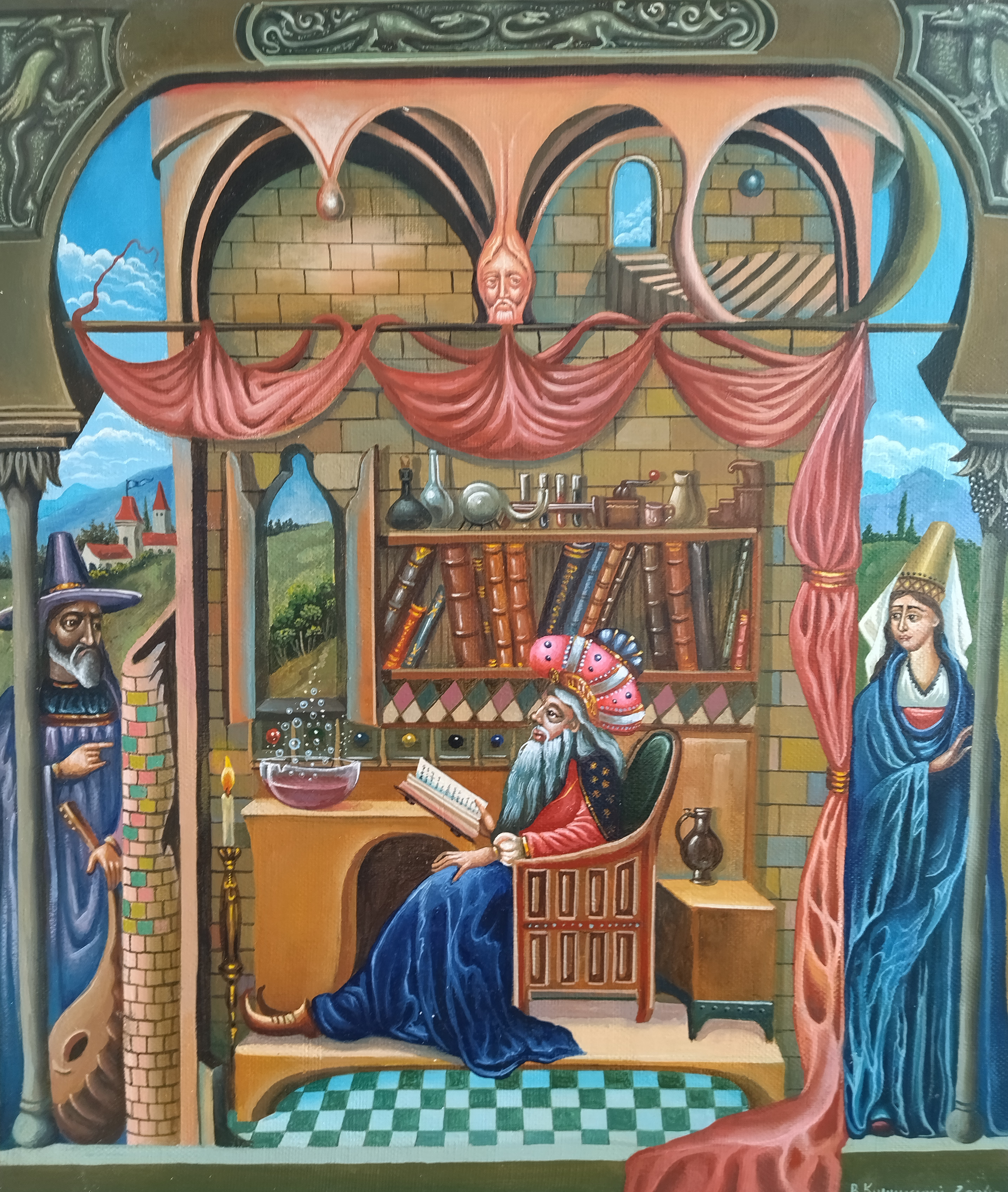 Картина Владимира Кучинского «Alchemist» представляет собой живописную и сложную композицию, наполненную символизмом, историческими аллюзиями и размышлениями о познании мира. Художник использует насыщенную, но гармоничную цветовую палитру и детальный стиль живописи, чтобы создать атмосферу тайны, эрудиции и стремления к высшему знанию, характерную для образа алхимика. Это не просто изображение человека за работой, а визуальное воплощение алхимического процесса, преобразующего не только материю, но и душу.