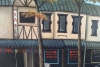 В центре внимания картины — улица, уходящая в перспективу. По обеим сторонам улицы расположены дома разной высоты и архитектуры. Слева — низкие здания с остроконечными крышами, напоминающие старинные европейские постройки. Их фасады, выполненные в светлых тонах, выглядят уютно и приветливо. Справа — более высокие здания, выполненные в строгом стиле с прямыми линиями и большими окнами. Их серые стены создают ощущение монументальности и прочности.