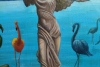 Картина Владимира Кучинского «Розовый фламинго в развалинах цивилизации» — сюрреалистическая композиция, наполненная символизмом и философским подтекстом. Художник противопоставляет хрупкую красоту природы упадку и разрушению творений человека, создавая атмосферу меланхолии, размышлений о бренности бытия и надежды на возрождение. Это не просто пейзаж, а визуальная притча о взаимоотношениях человека и природы, ценности жизни и вечном цикле созидания и разрушения.