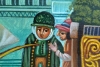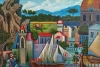 На заднем плане картины изображен живописный пейзаж, состоящий из различных элементов: города, полей, гор и неба. Город, выполненный в ярких, радостных тонах, кажется сказочным, привлекая взгляд своей необычной архитектурой и создавая ощущение волшебства. Поля, покрытые золотым ковром, символизируют плодородие, процветание и связь с землей. Горы, возвышающиеся на горизонте, придают пейзажу ощущение величия и мощи.
