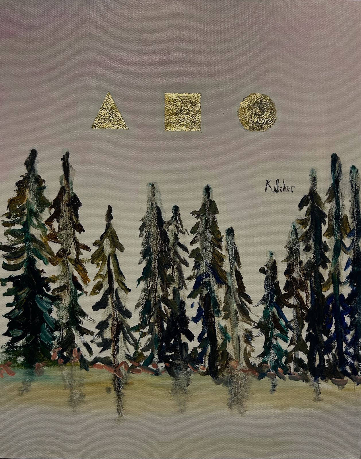 Над лесом парят три золотых архетипа — треугольник, квадрат и круг, воплощающие путь Духа к целостности.