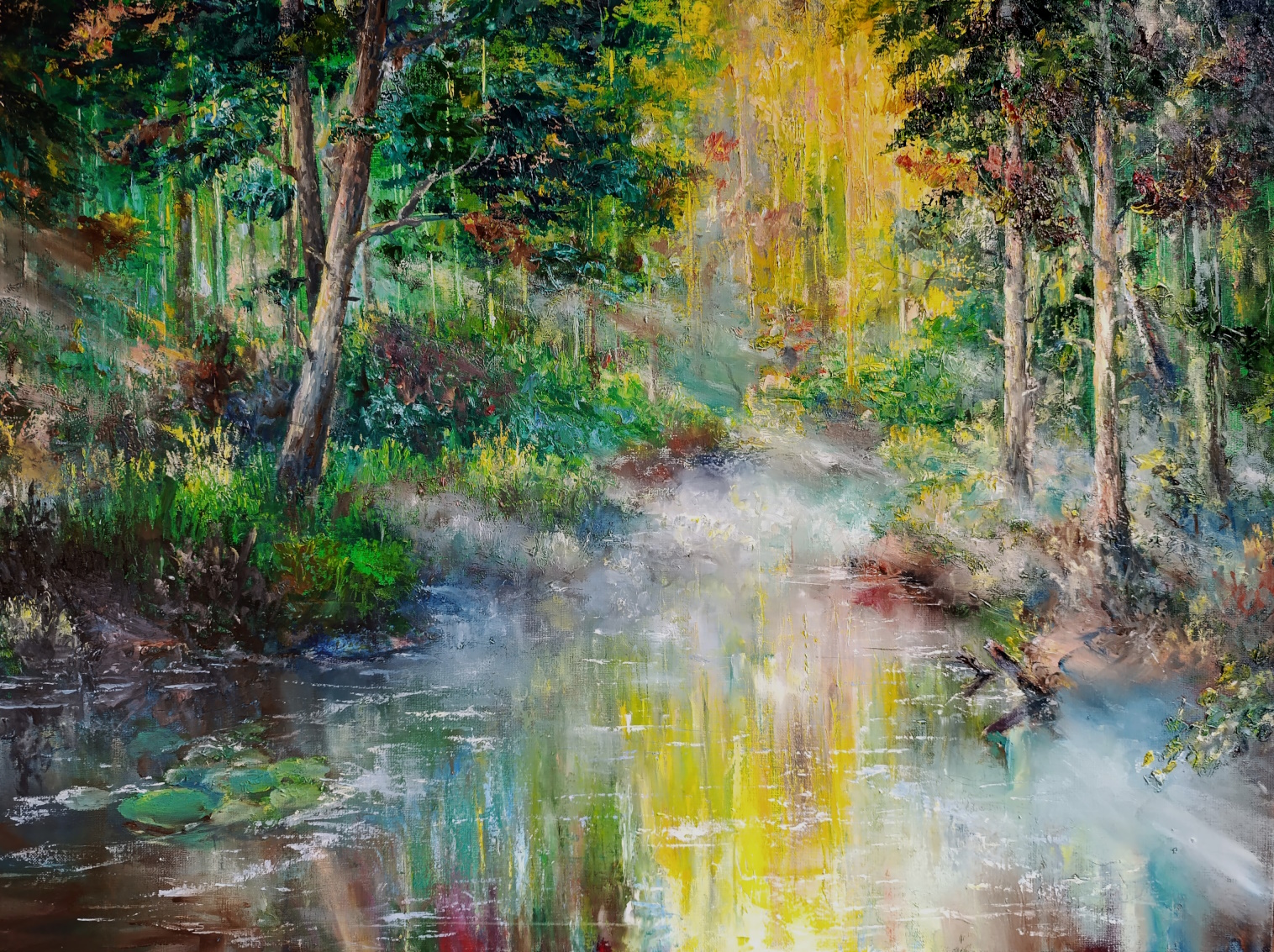 Картина "Лесная сказка" переносит зрителя в волшебный уголок девственной природы. Художник мастерски изобразил лесной пейзаж с живописной рекой, окруженной густыми деревьями и пышной зеленью. Теплые лучи солнца пробиваются сквозь листву, отражаясь на поверхности воды золотистыми бликами, создавая сказочную и умиротворяющую атмосферу. Игра света и тени придает картине глубину и выразительность, а мягкие мазки наполняют ее жизнью и гармонией.Эта работа идеально подойдет для украшения интерьера, создавая ощущение покоя и единения с природой.