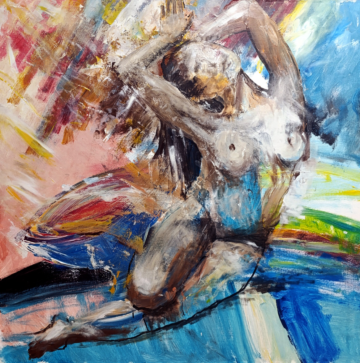 The painting by Ilgiz Murtazin “The Birth of Eve” is a powerful, expressive canvas dedicated to the themes of creation, femininity, and awakening. The artist departs from academic precision, using dynamics and color to convey a mythological moment.