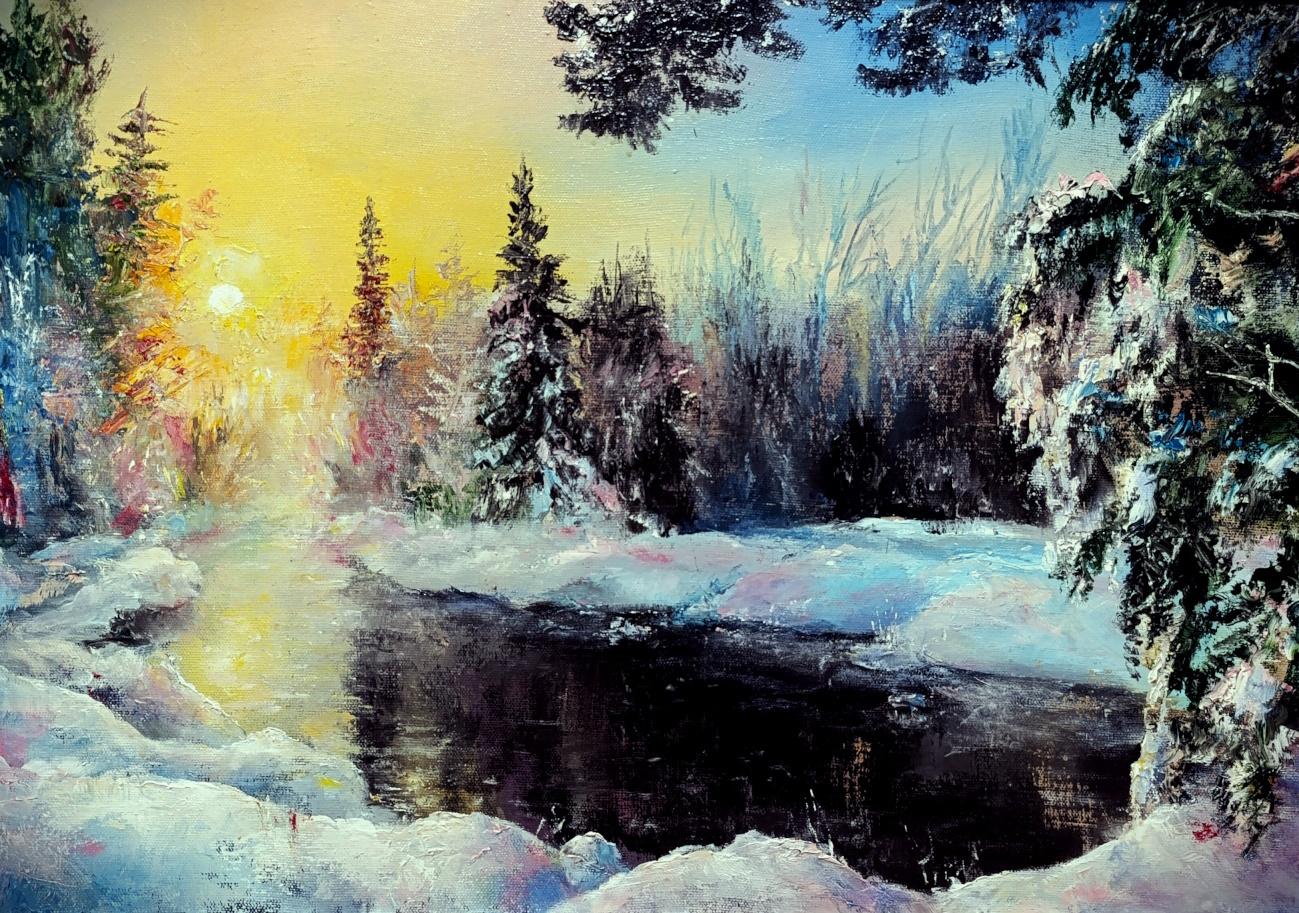 The canvas is filled with anticipation of a new day. On the left, on the horizon, the rising sun breaks through the fog, flooding the sky with a cascade of warm yellow and peach tones. This bright light contrasts with the cold blue shadows on the snow and the dark, almost black water of the river flowing through the center of the composition.