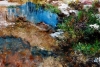 The central element is a small reservoir, painted in rich, almost otherworldly ultramarine. The deep blue sharply contrasts with the surrounding landscape. The water serves as a perfect mirror, reflecting fragments of the sky and creating the sensation of a vertical rupture in the horizontal plane.