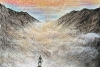 The landscape surrounding the figure is a rugged mountain range painted in somber, earthy gray and brown tones. The mountains have a strong relief texture that conveys their massiveness and antiquity. In places, mist or clouds emerge, enveloping the slopes, adding mysticism and depth to the painting.