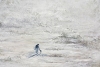 В центре обширного текстурированного пространства — две маленькие фигуры: женщина и ребёнок, идущие вместе, держась за руки. Их тёмные силуэты резко контрастируют с ослепительно светлым, почти монохромным фоном, напоминающим заснеженный пейзаж, туманное поле или облака.