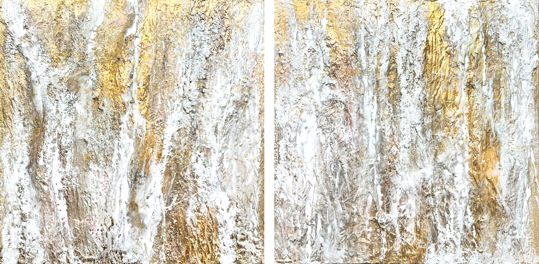 Художница создала многослойную текстуру, обильно накладывая краску, что придаёт работе почти скульптурный рельеф. Преобладание золотых и бронзовых оттенков, пробивающихся сквозь густые белые мазки, имитирует игру света на поверхности воды или ослепительную пыльцу, подхваченную ветром. Разделение на две панели подчёркивает ритмичность и двойственность произведения, словно это два кадра одного стремительного мгновения.