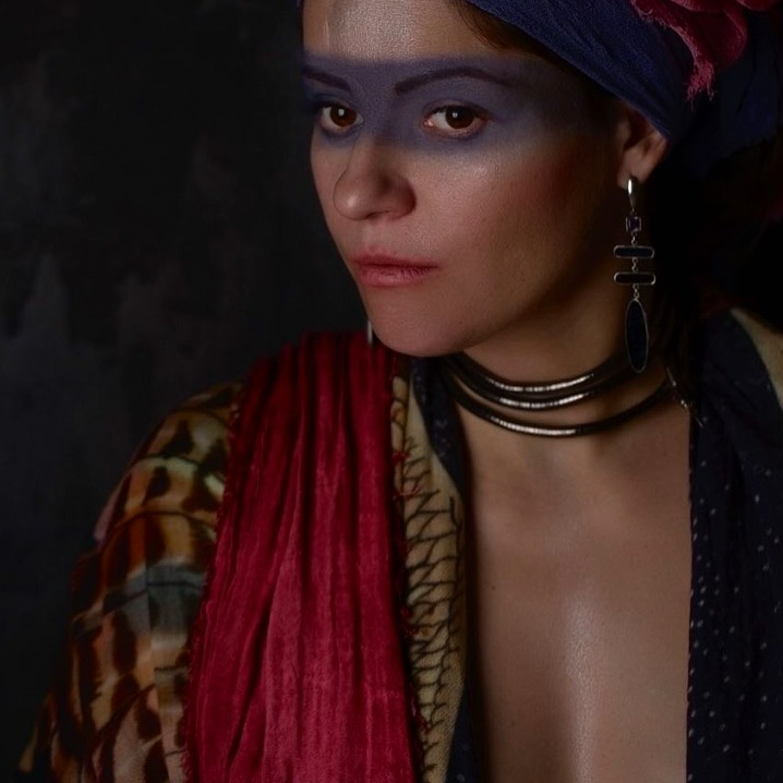 The artist uses rich symbolism. The girl is crowned with a shining headdress resembling a crown made of seashells, connecting her with the purity of waters and natural cycles. She tenderly holds a tiny Chihuahua dog, symbolizing care, innocence, and unconditional love.