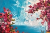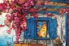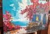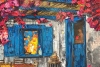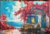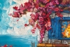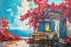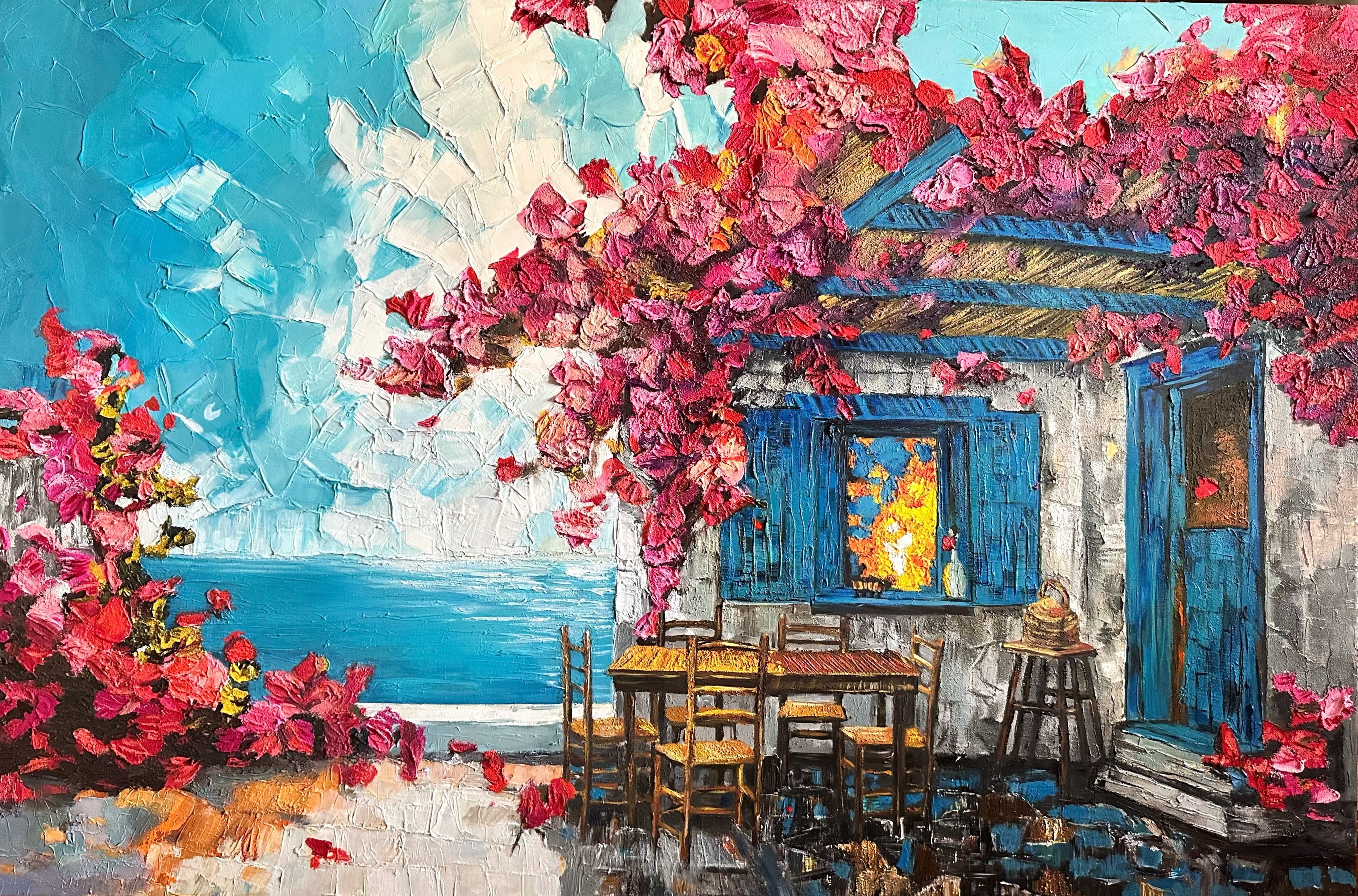 Яркая и насыщенная картина в стиле импрессионизма изображает уединенный летний дворик у моря. Грациозные розовые бутоны виноградной лозы обвивают старинный дом с ярко-голубыми окнами и дверью, создавая ощущение живой гармонии с природой. Теплое солнечное светило мягко освещает кадр, отражаясь в морской глади, а уютный деревянный стол с четырьмя ножками приглашает принять душ на свежем воздухе. Эта картина придает интерьеру утонченную свежесть, романтическую атмосферу и ощущение спокойствия, напоминая о красоте безмятежных летних дней на морском побережье