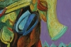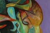 С первого взгляда можно различить очертания фантастического существа или фигуры, состоящей из элементов, напоминающих животных, рыб, маски и другие органические формы. Цветовая палитра богата и контрастна: доминируют оттенки жёлтого, красного, синего и зелёного, создавая ощущение энергии и движения.