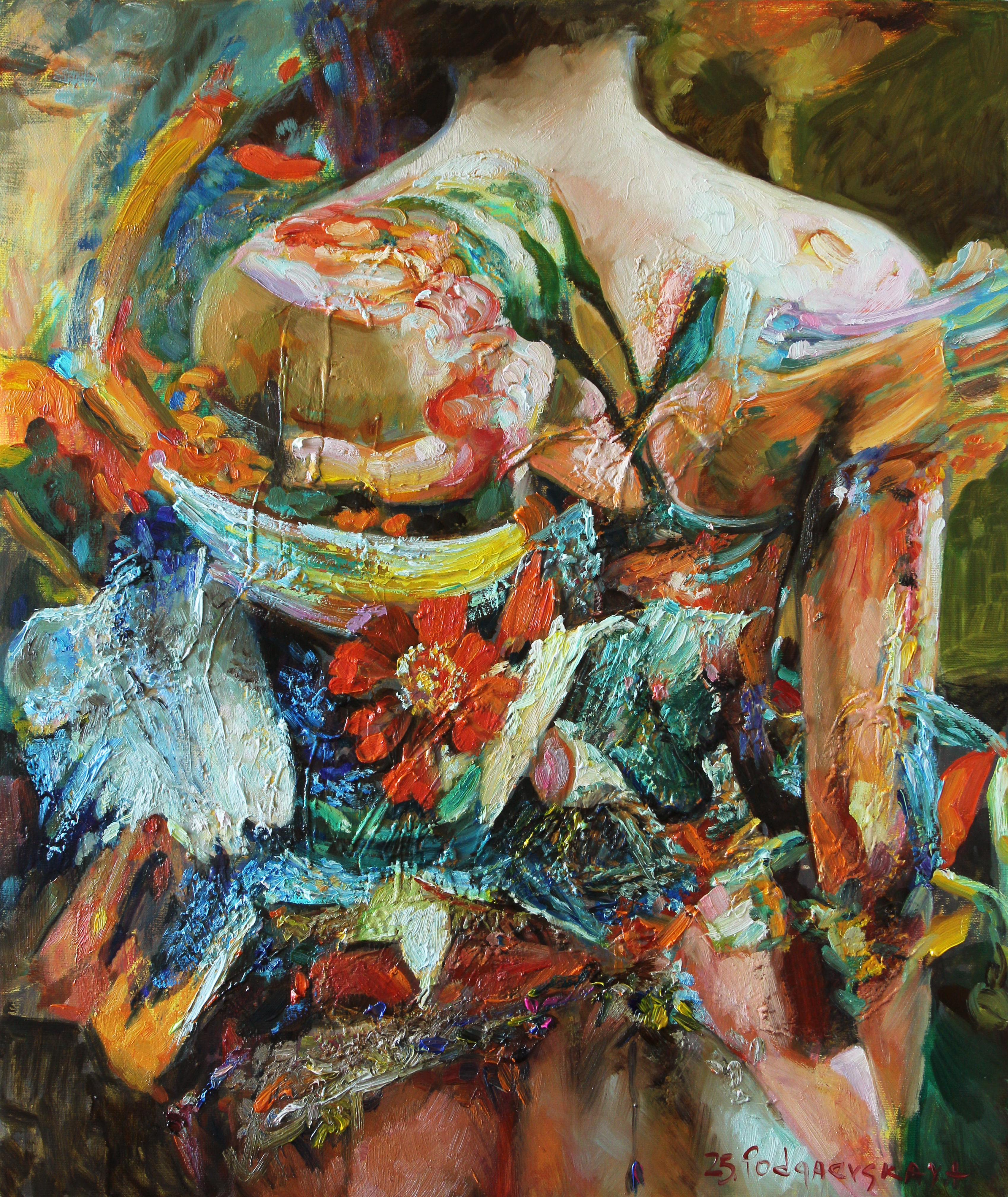 В этой картине я решила создать фантазию на тему женской красоты, получилась композиция в лёгком стиле: девушка, цветы... Множество красок, сочетание разных материалов придают картине неповторимый стиль, элементы абстрактного стиля, благодаря которым работа звучит по-новому.