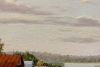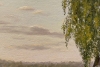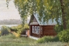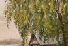 Художница тонко передает атмосферу покоя. Справа, под сенью раскидистой березы, уютно расположился деревянный дом с резными наличниками — символ тепла и надежности. Мягкий свет заливает травянистый склон, а спокойная вода реки на горизонте сливается с небом, стирая границы между землей и воздухом.