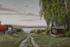 Картина Ольги Тикуновой «Деревня на берегу реки» — это окно в мир, где время течет неспешно, вторя дыханию реки. Перед нами классический сельский пейзаж: проселочная дорога, бегущая между деревенскими избами к широкому речному простору.