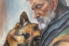 Собака, представитель служебной породы, также выглядит умиротворённой. Её голова прижата к плечу хозяина, а полуоткрытые веки говорят о полном расслаблении и доверии. Сочетание красных, чёрных и золотистых тонов в шерсти животного выполнено с большим мастерством, подчёркивая её текстуру и живость, несмотря на возможный преклонный «ветеранский» возраст пса.