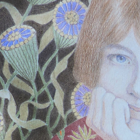 At the center of the composition is a female figure with red hair neatly styled. The face is rendered in a delicate, light manner, with a slight blush and gently squinting pale blue eyes looking to the side, expressing pensiveness or shyness. She has a single light, elegant flower pinned in her hair.