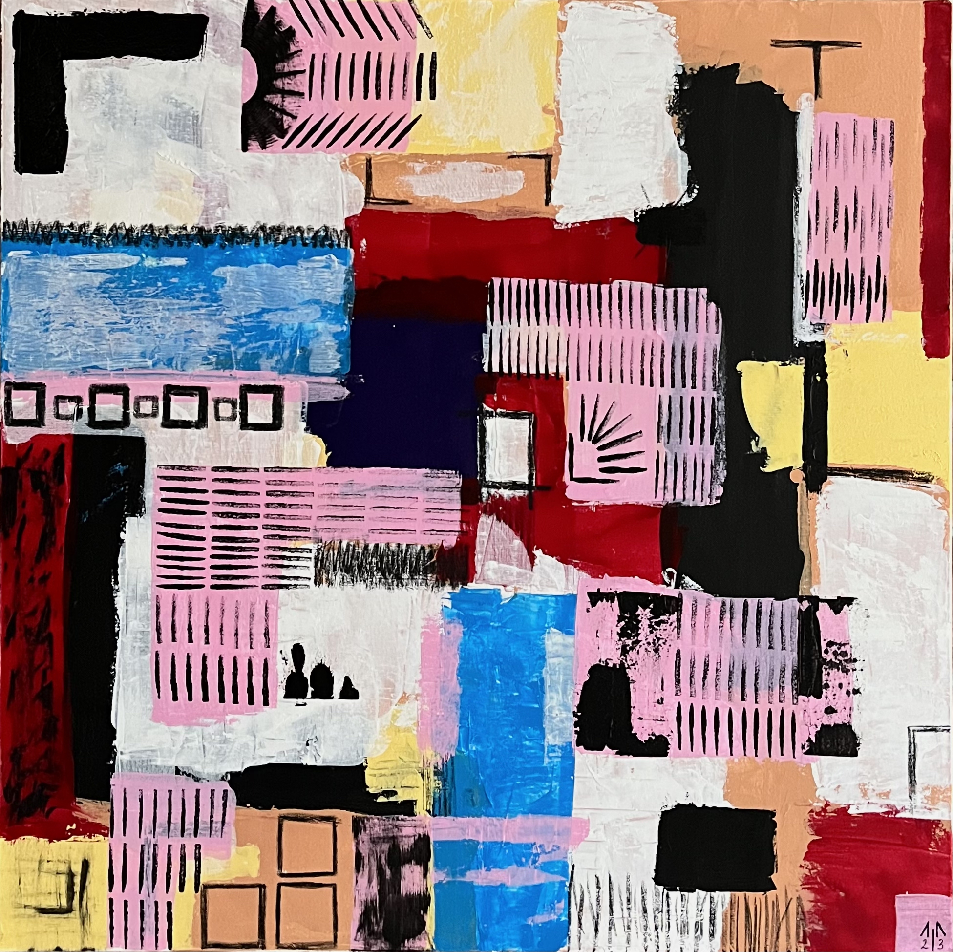 Картина состоит из множества прямоугольных и квадратных блоков, каждый из которых заполнен различными узорами, линиями и цветовыми пятнами. Эти элементы, словно осколки памяти, фрагменты мыслей и отголоски эмоций, образуют сложную и многослойную структуру. Хаотичное расположение элементов и их переплетение друг с другом создают ощущение динамики, движения и постоянных изменений.