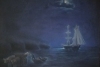 The action unfolds on the water surface, covered with a light ripple. On the right side of the painting, the silhouette of a sailing ship with partially raised light sails is visible. Its outlines are barely discernible in the darkness, but it appears to be moored or slowly maneuvering near the shore.
