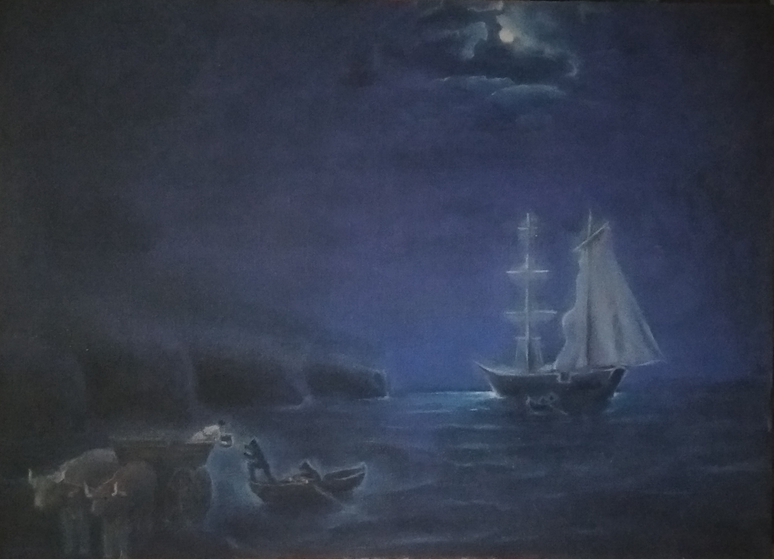 In the foreground, closer to the rocky shore (the silhouettes of which are barely visible on the left), smaller boats stand. Figures of people engaged in loading something dark and heavy can be distinguished. These vague shapes, hidden by the night, hint at an illegal, secret operation, corresponding to the painting’s title.