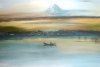 A picture of absolute tranquility. The river is calm and serene, like a mirror reflecting the boat and the boatman. The water seems motionless, creating a sense of time standing still. The boat and the boatman are the focal point of the composition, but they are depicted in a minimalist style, as if they are fading into the surrounding space. In the background, a mountain stands tall and mysterious, yet blurred, as if it were on the edge of reality and dreams. The colors are soft and muted, but there is something special about them — subtle hints of bright hues that evoke a warm and luminous feeling in the viewer's soul. The use of texture paste and acrylic gives the painting depth and volume, making the mountain appear almost tangible. The technique resembles oil painting, with its smooth transitions and rich colors. The semi-abstract style, with its soft and blurred lines and shapes, creates a sense of uncertainty and mystery, allowing the viewer to fill in the details and immerse themselves in the atmosphere of the painting. This work is not just a landscape, but a