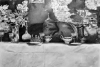 In the background behind the table, a wall with crumbling brickwork and a boarded-up window is visible. This dilapidated setting sharply contrasts with the elegance of the crockery and flowers, creating a feeling that time has stopped or already passed.