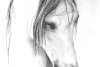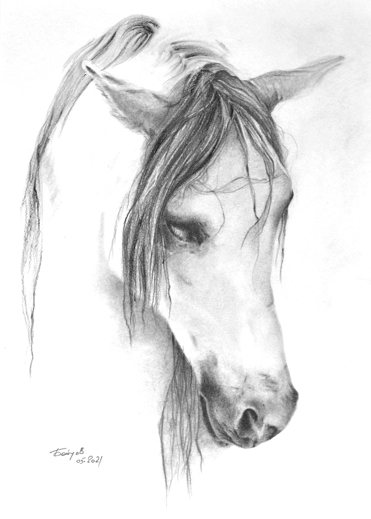 Художник филигранно работает карандашом, передавая игру света и тени на морде животного. Каждая линия подчеркивает хрупкость и в то же время мощь образа. Выразительный, чуть печальный взгляд «Валенсии» придает портрету глубину, превращая анималистический этюд в глубоко эмоциональное высказывание.