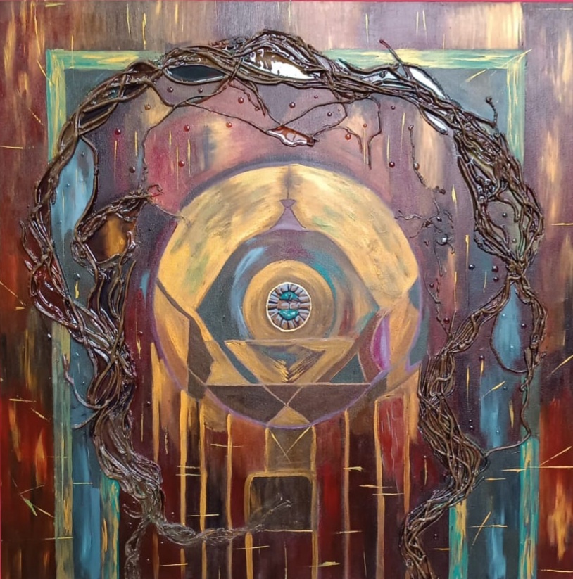 Работа выполнена на холсте, размером 80х80, с использованием текстурной пасты, эпоксидной смолы и акриловых красок.