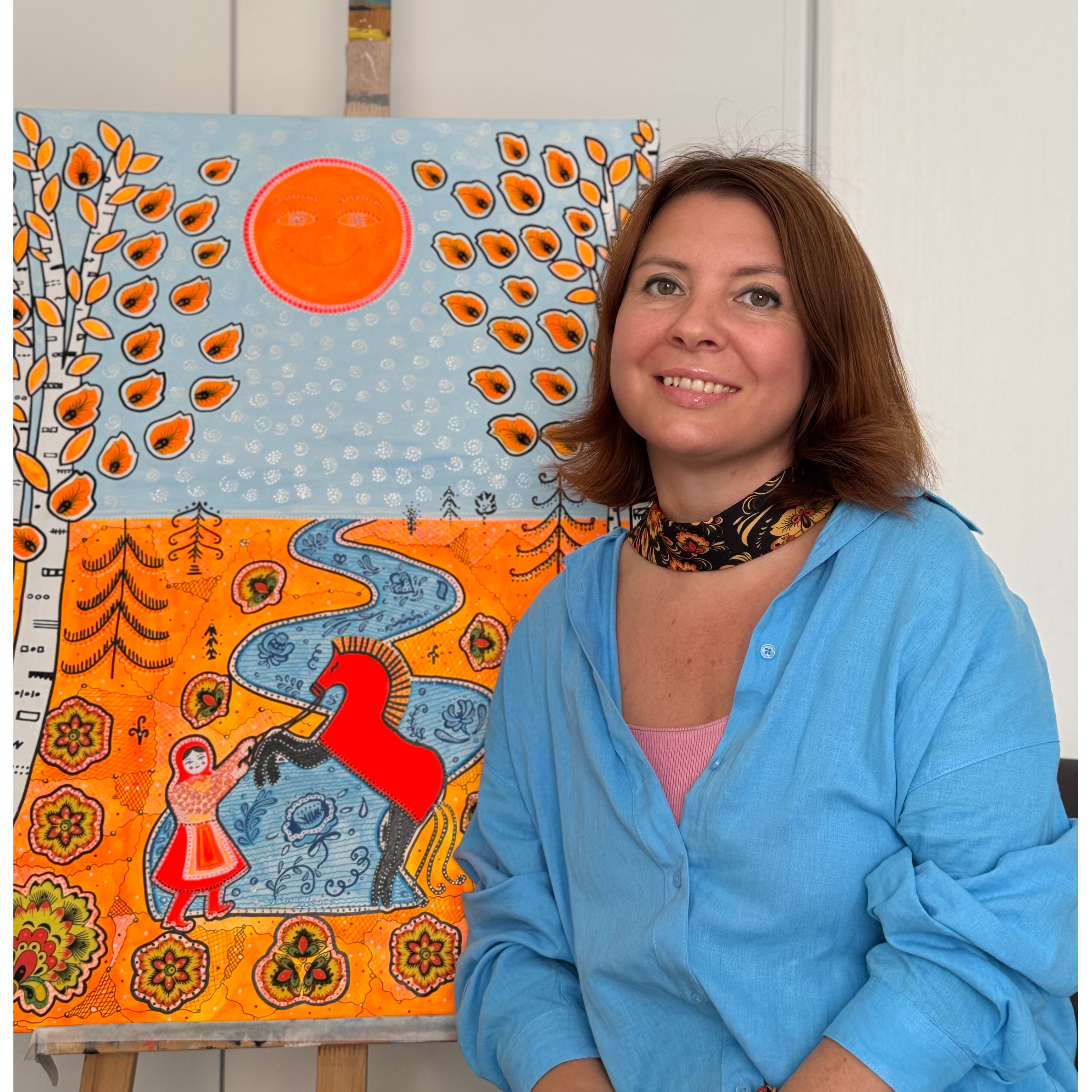 Композиция обрамлена яркими, богато декорированными элементами, характерными для русского народного прикладного искусства, напоминающими хохломские или жостовские мотивы. Эти яркие оранжево-жёлтые «цветы» или созвездия создают декоративную рамку, которая привносит теплоту и земную идентичность в холодное космическое пространство.