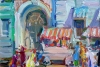 Центральным элементом композиции выступает величественная широкая арка, вероятно, вход в старинное здание или торговые ряды. Её монументальность передана широкими мазками, подчёркивающими игру света и тени внутри свода. Справа от арки виднеется торговая лавка или навес с полосатым тентом, выполненным в ярких красно-оранжевых тонах, что сразу привлекает внимание и намекает на оживлённую торговлю или ярмарочную суету.
