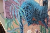 Фон картины представляет собой тропический пейзаж с мягкими оттенками желтого, розового и зеленого, что подчеркивает контраст между животным и окружающей средой. В нижней части картины изображены три фигуры людей, занятых своими делами. Они одеты в светлые одежды, что добавляет композиции легкости и гармонии.