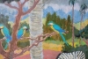 На заднем плане изображены высокие пальмы и деревья с густой кроной, создающие ощущение тропического леса. В левой части картины на ветке дерева сидят три ярко-голубых попугая, добавляющие композиции динамики и цвета.