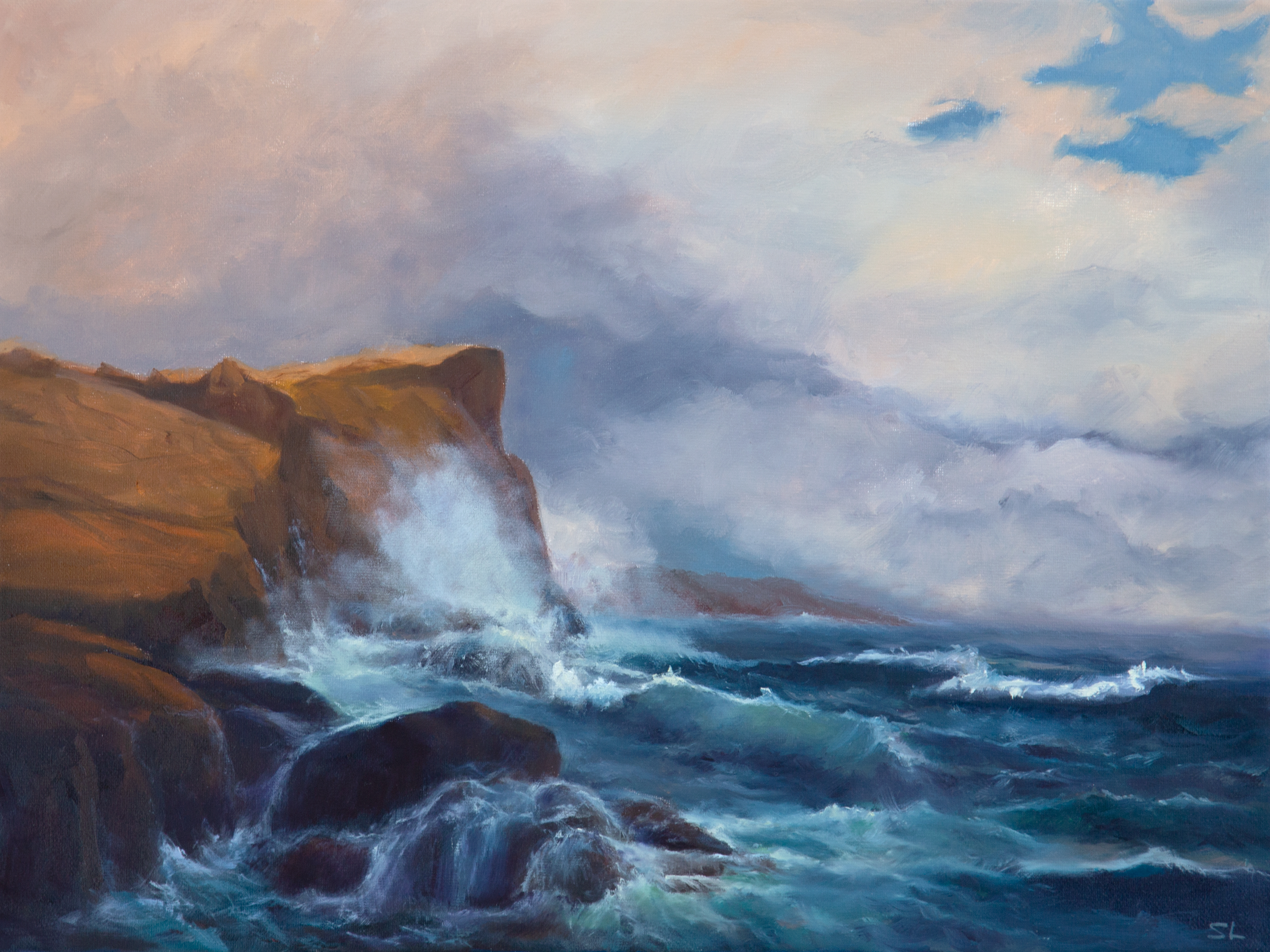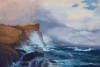 Waves crash against the rocky shore, creating clouds of snow-white spray. The golden cliffs contrast with the deep blue of the raging sea, and the dramatic sky heightens the sense of the elemental power. A moment of collision between water and rock, where the energy of the ocean meets the steadfastness of the shore.