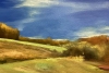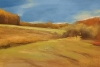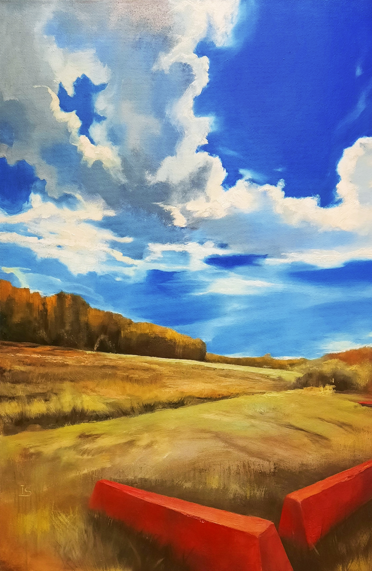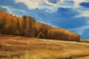 Calm senery scape of golden Autumn field and forest, but some strange red blocks on the front view add a bit tricky atmosphere: if ia anybody there?