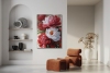 Картина выполнена в технике холст-масло. На ней, крупным планом, изображены алые и белые бутоны цветов, передающие энергию и гармонию окружающей нас природы, словно приглашая в мир живописи, где каждый штрих и цвет созданы для того, чтобы оживить душу и превратить дом в настоящую галерею искусства.