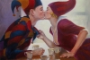 Персонажи Арлекин и Коломбина, нежный поцелуй во время кофейной дегустации.