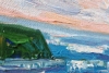В центре композиции — берег моря, где песчаная полоса встречается с морем. София использует тёплые пастельные тона для изображения песка — оттенки бежевого, розового и светло-жёлтого, которые переливаются под лучами солнца. Мазки здесь мягкие и рассыпчатые, они передают текстуру песка и его лёгкую влажность. По краям картины, у самого берега, изображена зелень — трава и небольшие кусты, написанные яркими, насыщенными зелёными оттенками. Эти элементы добавляют картине природной живости и контраста.
