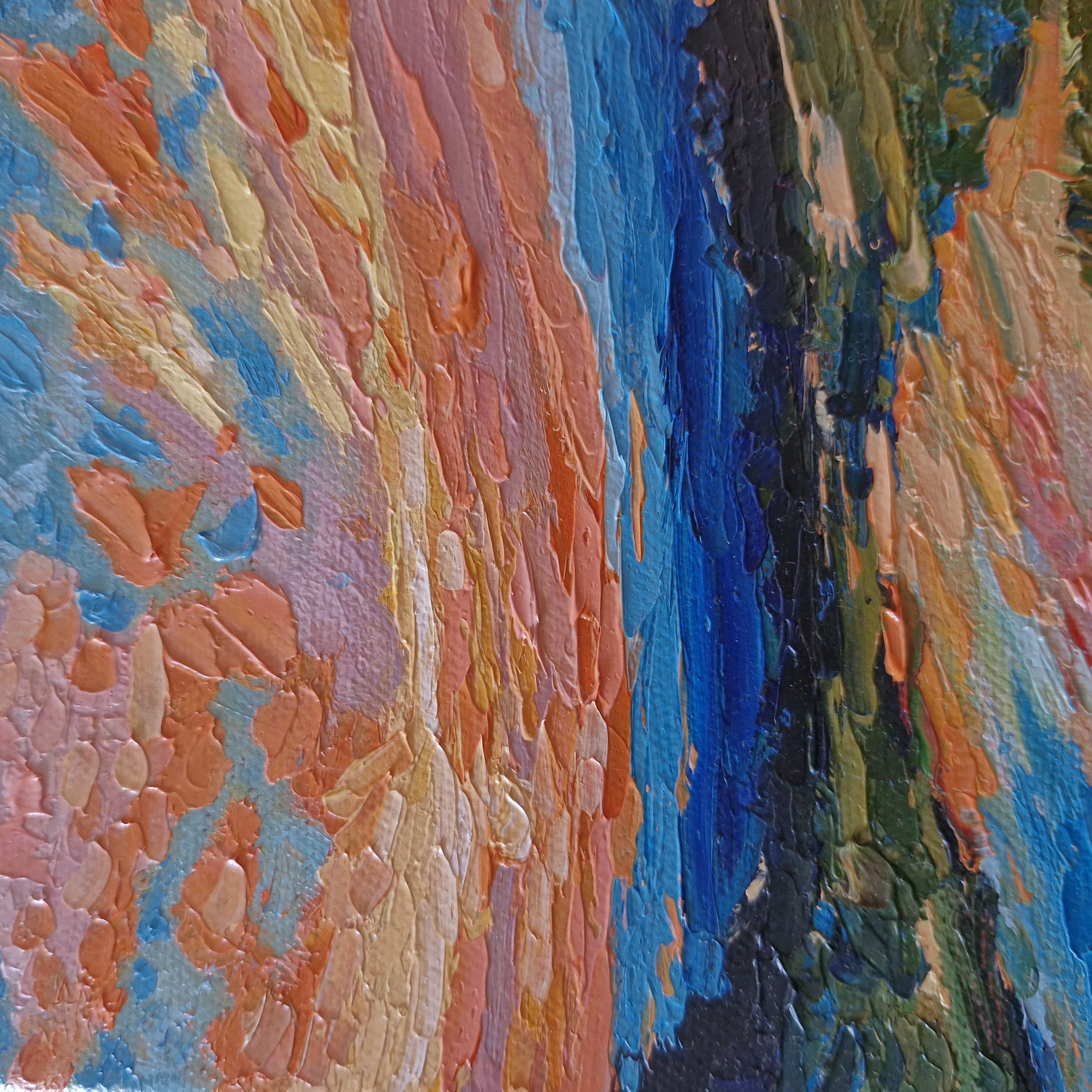 Картина Софии «За рекой» — это захватывающее дух изображение заката над речной долиной, написанное с невероятной живостью и эмоциональностью. Художница использует яркую, экспрессивную палитру, чтобы передать всю красоту и драматизм момента, когда солнце уходит за горизонт, окрашивая небо и землю в пылающие цвета.