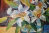 Художница мастерски работает с цветом: белизна лепестков дополнена тонкими вкраплениями жёлтого и охры в сердцевинах, что придаёт лилиям особую выразительность и объём. Прозрачная ваза, в которой стоит букет, добавляет работе лёгкости, позволяя зрителю оценить игру света сквозь стекло. Контраст между тёплым основанием стола и прохладными синими тенями подчёркивает утончённость каждой детали.