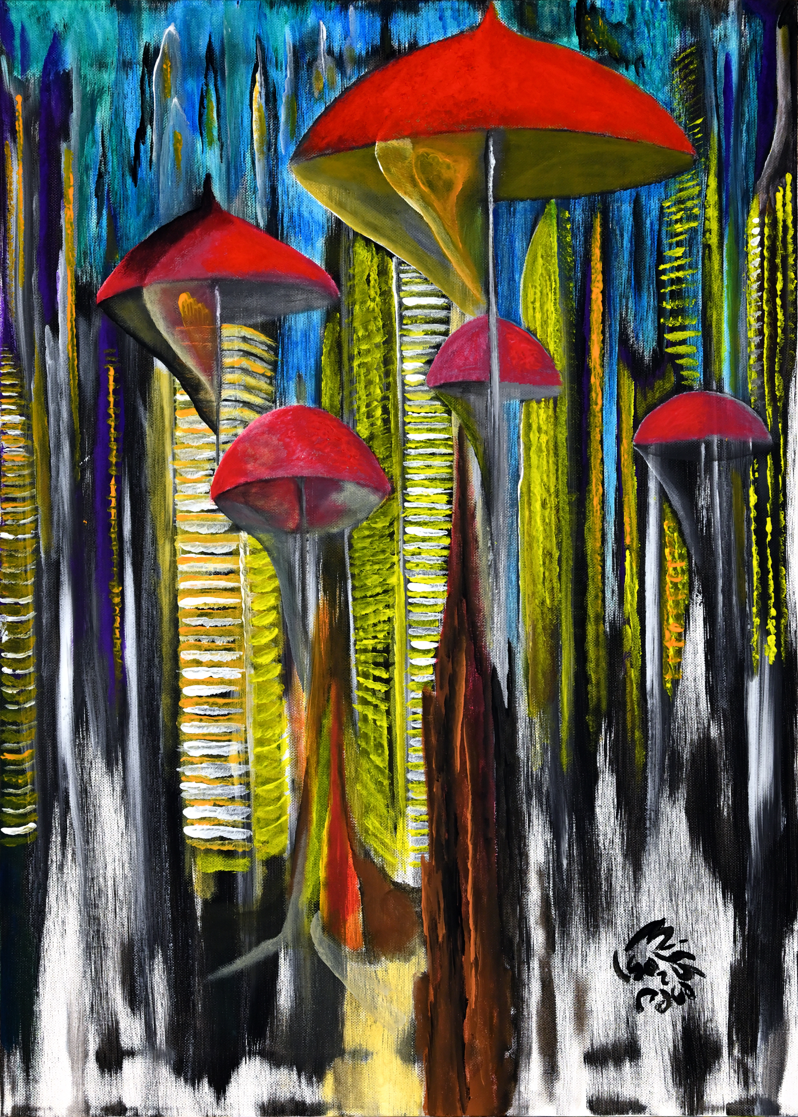 The painting is made on canvas. On the front side is a signature, on the back side is the title, year of creation, technique, and size.