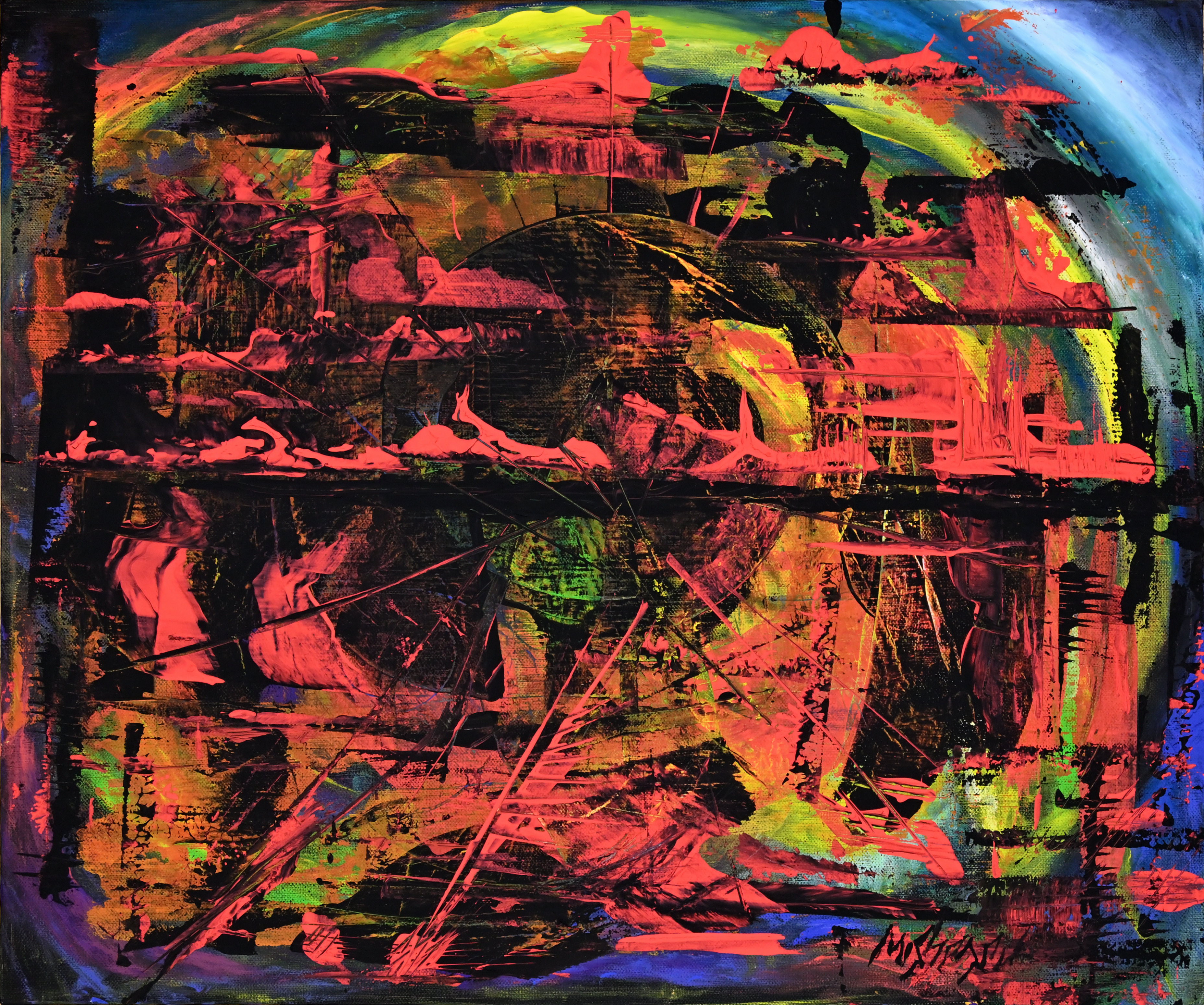 The painting is made on canvas. On the front side is a signature, on the back side is the title, year of creation, technique, and size.