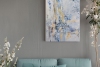 Эта полуабстрактная композиция сочетает в себе нежные цветовые элементы, которые словно растекаются под первыми теплыми лучами солнца, и отчетливо узнаваемые черты открытого окна. Цветовая гамма картины включает мягкие переходы голубого и ультрамарина, обрамленные солнечным желтым и чисто белым.