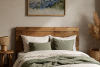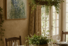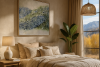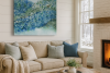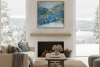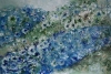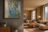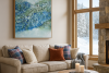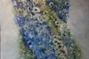 Цветочные элементы, словно застывшие в мимолетном диалоге, склоняются один к другому, будто желая поделиться тайной. Их лепестки написаны плотными мазками масла, создающими ощутимую фактуру. Мягкие цветовые переходы от ультрамарина к небесно-голубому, зелёные тона — от светлого, почти прозрачного до глубокого лесного — образуют удивительное и нежное пространство. Белые акценты вспыхивают, как отблески солнечного света на каплях росы.