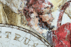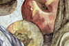 На блюде покоятся бархатистые персики — их нежная кожура пропитана летним зноем, но плоды скоро увянут, превратившись в полупрозрачную тень. Грубые складки ткани обрамляют центральную часть, как страницы древнего свитка, где когда-то цвели краски. Бюст этрусской богини Уни, покровительницы плодородия, не пощадило время: каждый скол, каждая трещинка — словно морщины, за которыми скрывается своя история. Художественные средства мастерски передают фактуру разрушения: монохромная ткань — как иссушенная солнцем земля, потрескавшийся мрамор, отдающий солнечное тепло.