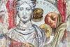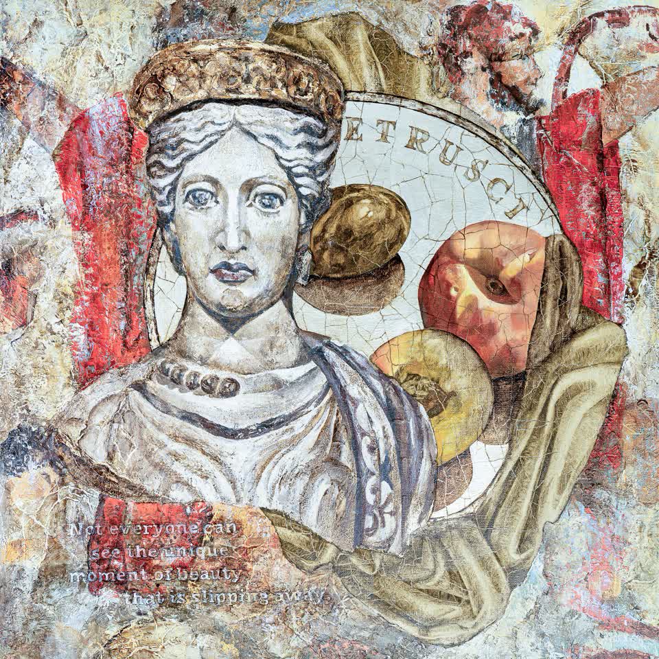 На блюде покоятся бархатистые персики — их нежная кожура пропитана летним зноем, но плоды скоро увянут, превратившись в полупрозрачную тень. Грубые складки ткани обрамляют центральную часть, как страницы древнего свитка, где когда-то цвели краски. Бюст этрусской богини Уни, покровительницы плодородия, не пощадило время: каждый скол, каждая трещинка — словно морщины, за которыми скрывается своя история. Художественные средства мастерски передают фактуру разрушения: монохромная ткань - как иссушенная солнцем земля, потрескавшийся мрамор, отдающий солнечное тепло.