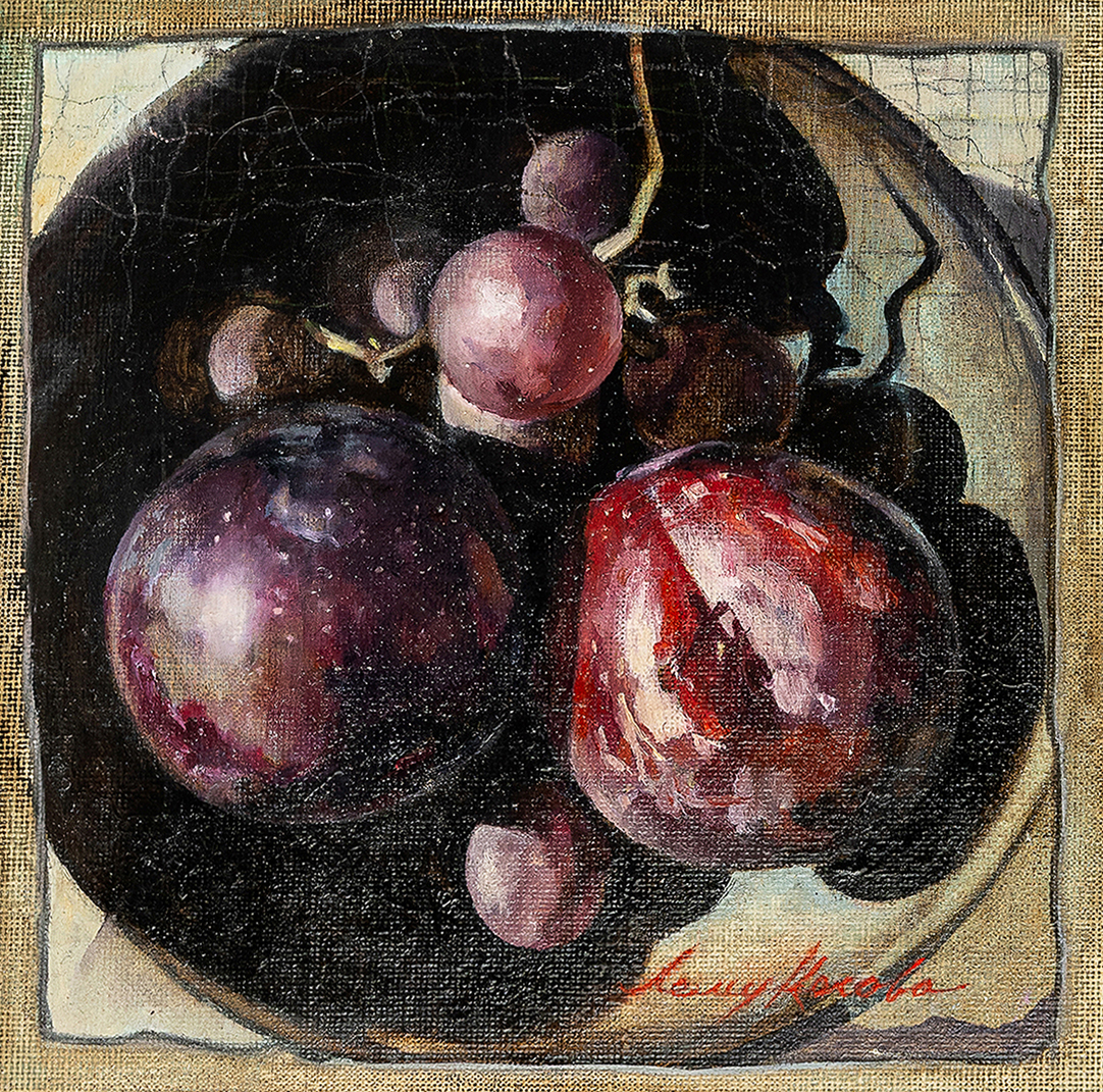 “Symphony of Color” is a painting where the purity and saturation of colors come together in a harmonious sound, similar to a musical chord. The view from above reveals a composition of ripe plums and grapes resting on a smooth layer of light glaze. Sunlight glints off the firm flesh, while deep shadows emphasize the flawless sheen of the skin, making it almost tangible. Transparent layers of paint flash with juiciness, then melt into the summer haze, reminding us of the fleeting beauty of the moment.