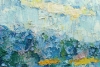 На переднем плане – золотисто-желтое поле, написанное широкими, сочными мазками. Это поле подсолнухов или спелых колосьев, источающее аромат лета и щедрость природы. Яркие, насыщенные цвета создают ощущение тепла и жизненной силы, передавая атмосферу солнечного дня.