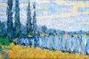 По левую сторону выстроились стройные, темные силуэты деревьев. Их вертикальные формы контрастируют с горизонтальным течением реки и поля, добавляя композиции структурность. Эти деревья, возможно, кипарисы или тополя, стоят как молчаливые стражи, окутанные легкой дымкой, создаваемой теплыми ветрами. Их темно-зеленый цвет с вкраплениями синего и фиолетового придает глубину и загадочность.
