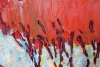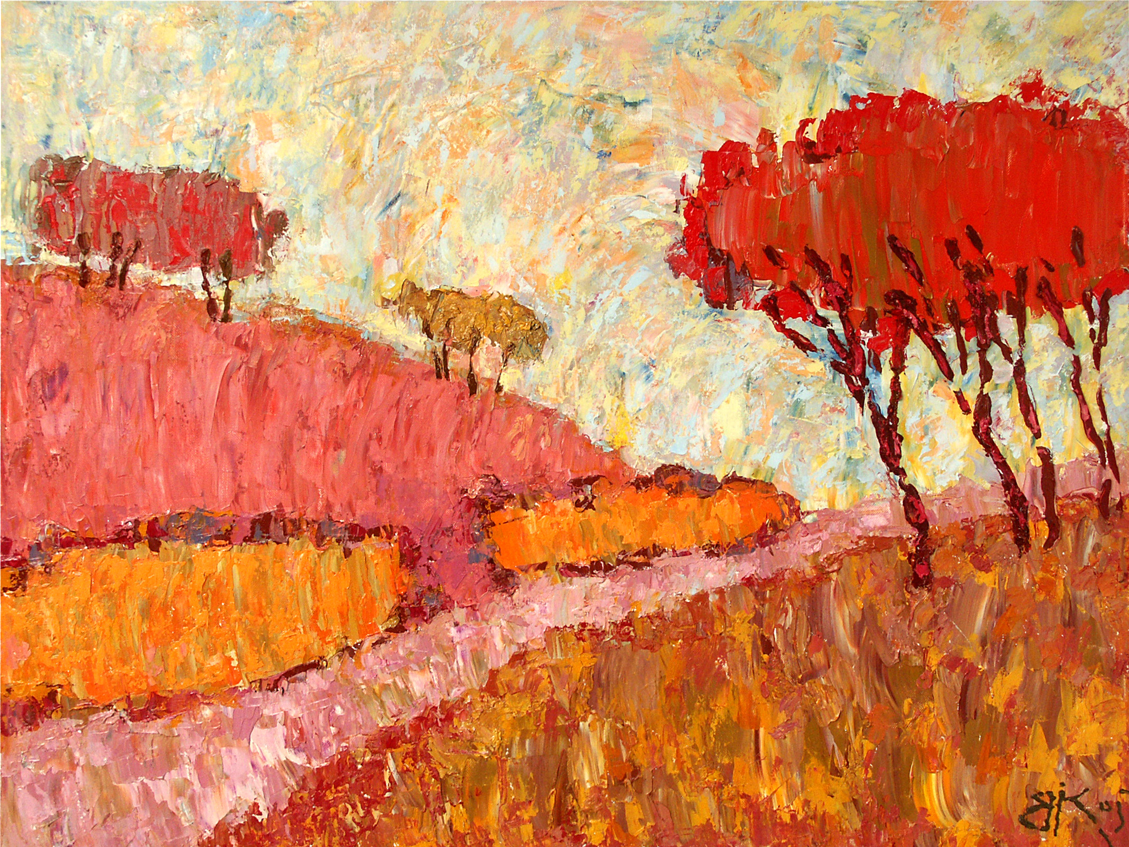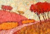 На картине преобладают яркие, огненные оттенки: насыщенные красные, глубокие оранжевые, золотисто-жёлтые. Эти цвета, нанесённые густыми рельефными мазками, создают ощущение жара, пыла, словно сама природа горит осенним огнём. Красные деревья с пышными кронами, словно маяки, привлекают внимание, их цвет настолько интенсивен, что кажется, будто они сами излучают тепло.