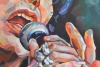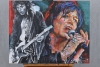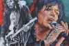 Tom Keifer "Cinderella" band is painted early in his career and in the today time. The past time is painted in black and white, the present is bright colored.